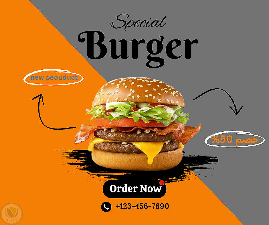 قمت بتصميم إعلان سوشيال ميديا احترافي لمتجر (بيع بيرجر)، مع التركيز على جذب الانتباه باستخدام ألوان مناسبة وخطوط واضحة لزيادة التفاعل والمبيعات. التصميم مناسب للنشر على فيسبوك وإنستجرام.