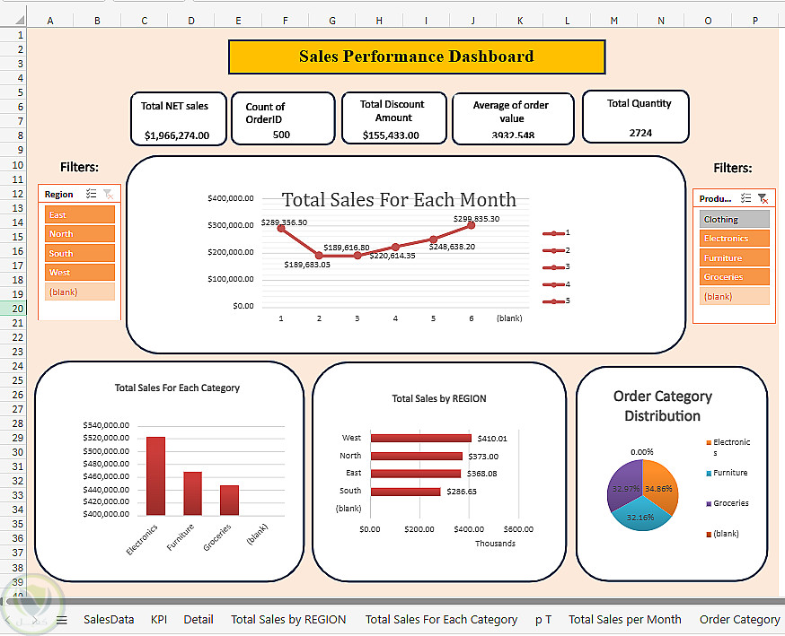 داشبورد تفاعلي باستخدام اكسيل يوضح اداء المبيعات