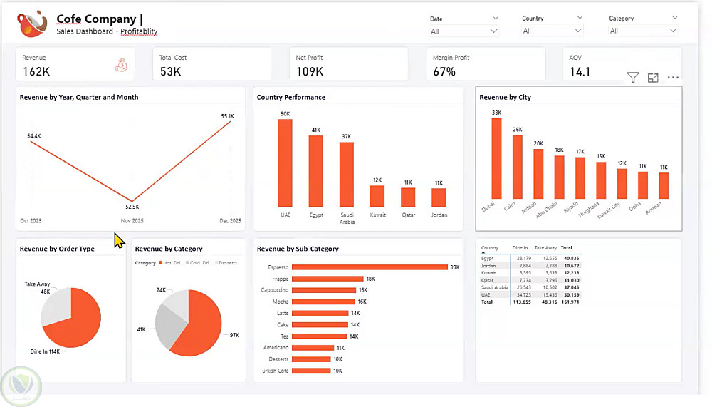 تصميم Dashboard احترافية لتحليل مبيعات وربحية كافيه متعدد الفروع باستخدام Power BI