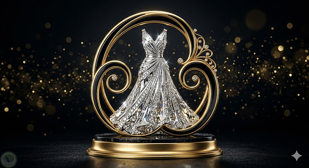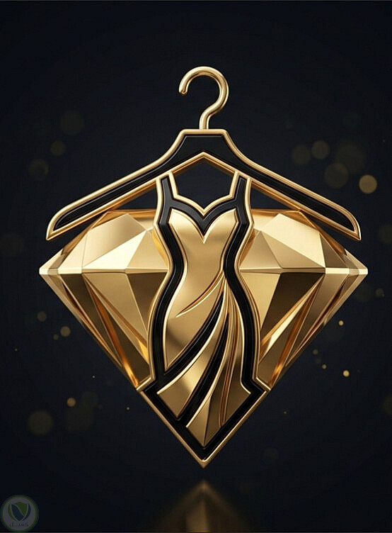 تصميم يدمج بين رمز الماسة (للتعبير عن الإكسسوارات) ورمز الفستان والشماعة (للتعبير عن الأزياء) في أيقونة واحدة متناغمة تعكس الفخامة