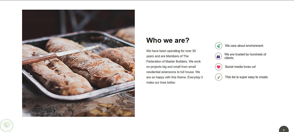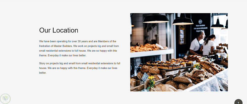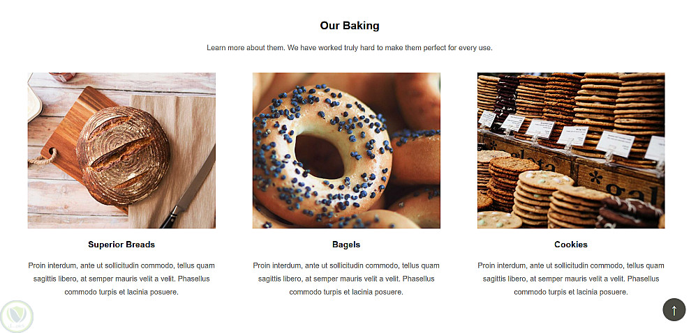 بعد كده قسم "Who We Are" بيعرّف بالمخبز مع قائمة مميزات، وقسم "Our Location" بـ layout معكوس، وقسم "Our Baking" بيعرض المنتجات في 3 كروت.