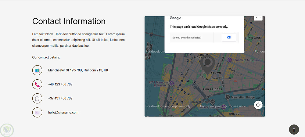 الصفحة بتنتهي بقسم Contact فيه معلومات التواصل وصورة خريطة، وفوتر بأربع أعمدة، وزرار scroll-to-top ثابت في الزاوية.
