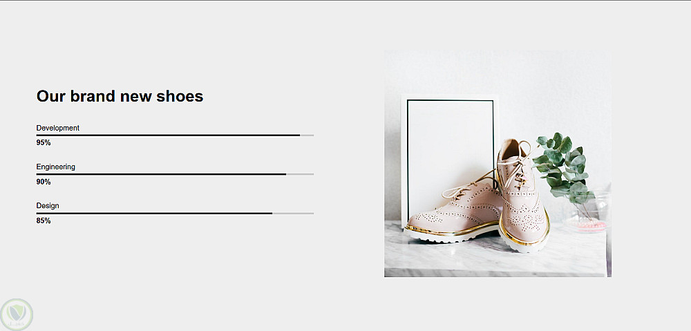 الصفحة كمان فيها قسم Blog بـ 3 مقالات، وقسم Features بـ CSS Grid بيعرض 4 مميزات بأيقونات، وقسم "New Releases" وقسم تاني بـ progress bars بيوضح نسب التطوير والهندسة والتصميم. الصفحة بتنتهي بقسم داكن للـ product presentation وفوتر أسود بسيط.