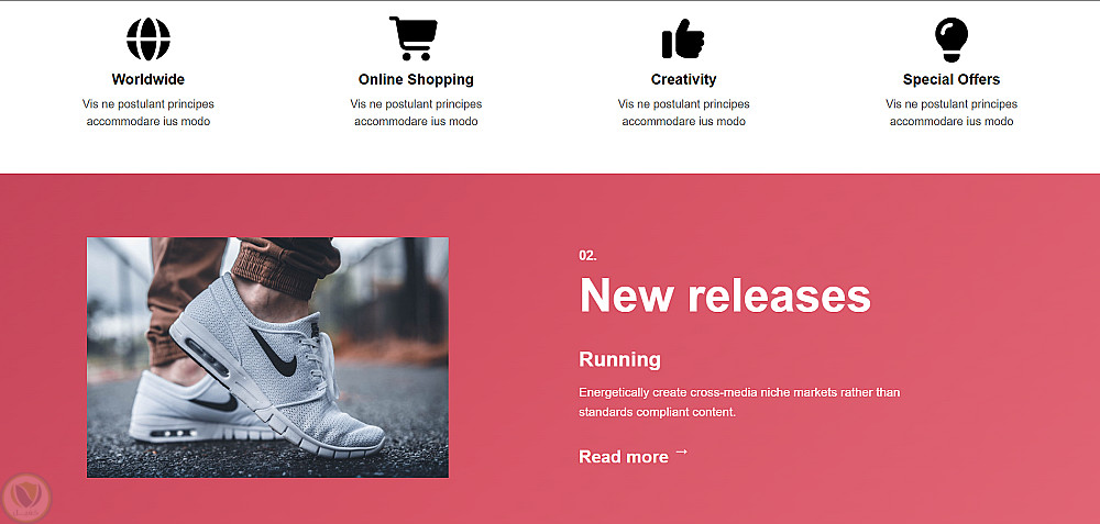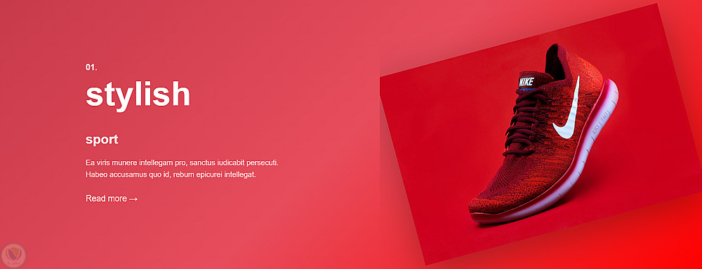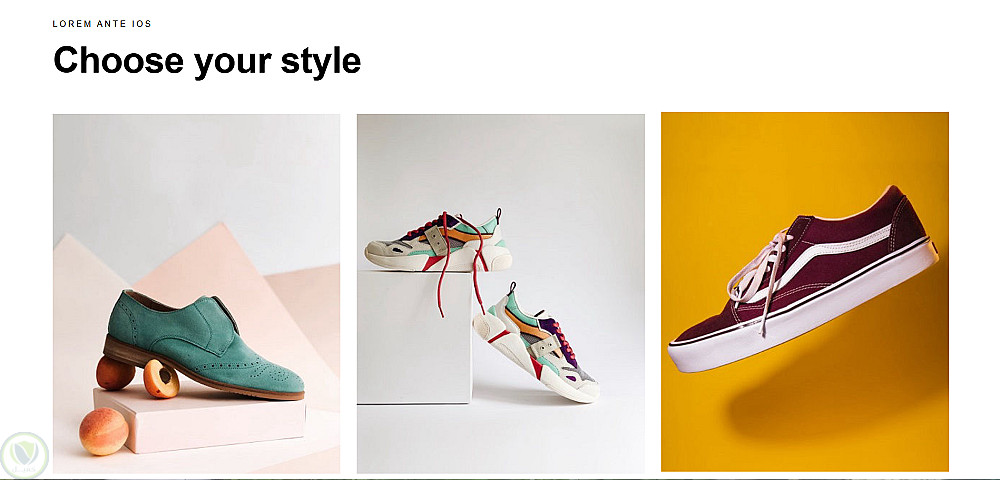 بعد كده في قسم "Choose your style" بيعرض 3 أنواع من الأحذية في كروت، وقسم بخلفية حمرا بيبرز حذاء معين بشكل مميز. وفيه قسم لعرض لوجوهات الشركات الشريكة بتأثير hover بيرجّع الأوبسيتي.