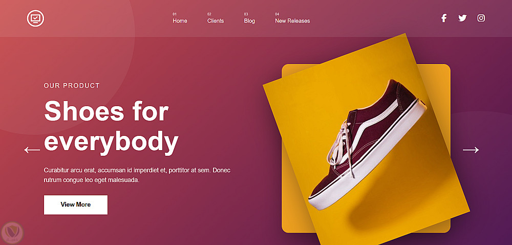 الموقع بيبدأ بـ Hero Section بخلفية gradient بين الأحمر والبنفسجي الغامق، فيها navbar بلوجو وروابط تنقل مرقمة (01-04) وأيقونات سوشيال ميديا، وفي المنتص عنوان كبير جنبه صورة الحذاء على خلفية صفراء.