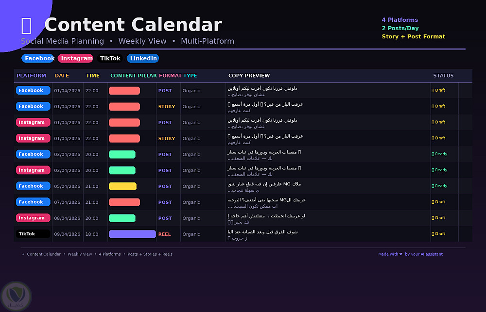 هتوفر وقتك وتبعد عن ضغطة "هنعمل إيه النهارده؟" — أنا هبنيلك خطة محتوى شهرية كاملة ومنظمة تناسب نشاطك التجاري وجمهورك المستهدف.