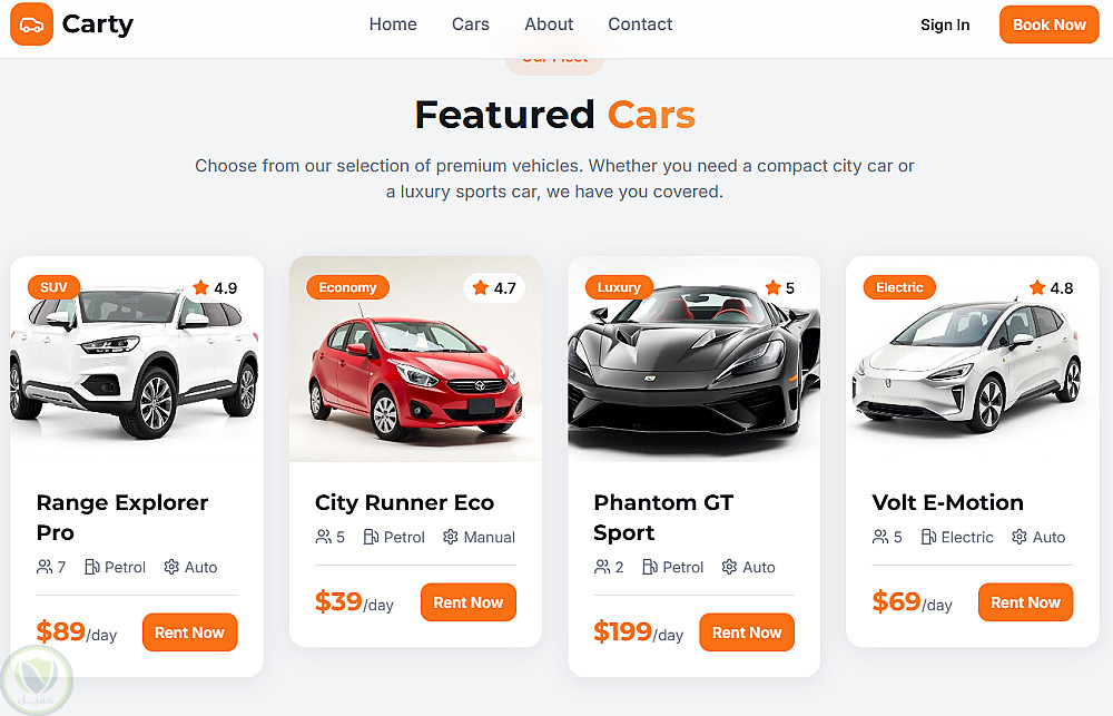 هذا المشروع هو واجهة مستخدم (UI) عصرية لمنصة رقمية متخصصة في تأجير السيارات الفاخرة تحت اسم "Carty".