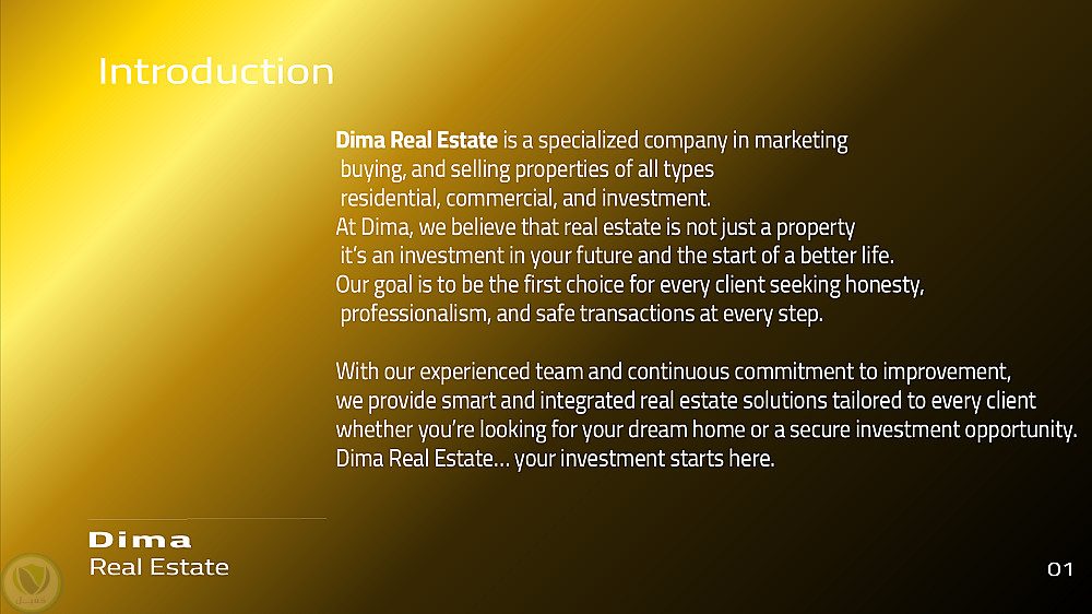 "ديما للعقارات" تضع نفسها في مقدمة الشركات العقارية من خلال هذه الهوية التي تبرز طموحها واحترافيتها في السوق العقاري.