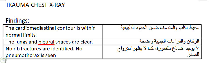 نموذج لترجمة تقرير أشعة متخصص (Trauma Chest X-Ray) من الإنجليزية إلى العربية.