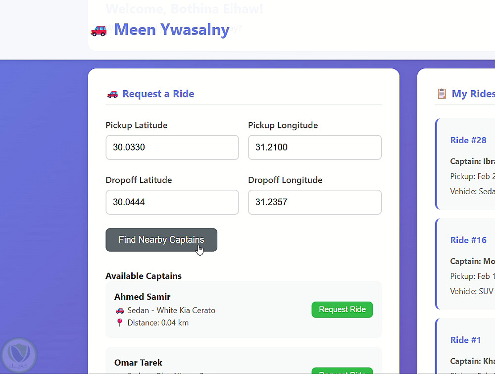 ظام قاعدة بيانات لتطبيق توصيل (Meen Ywasalny)