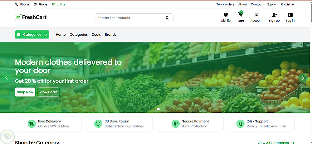 FreshCart هو تطبيق متجر إلكتروني حديث مبني باستخدام React، يوفّر تجربة تسوّق متكاملة تشمل تسجيل المستخدمين، تصفح المنتجات، إدارة السلة والمفضلة، وإتمام عمليات الشراء بسهولة.