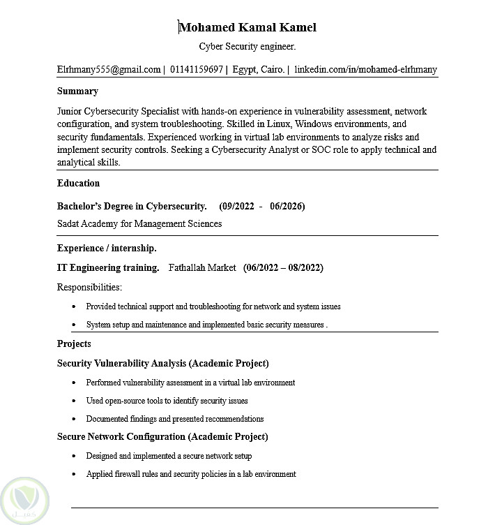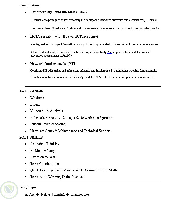 تم مراعاة معايير السيرة الذاتية الحديثة لجعلها متوافقة مع متطلبات سوق العمل.