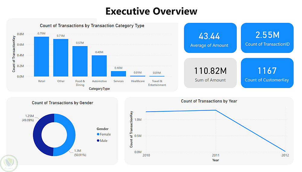 تعرض اللوحة إجمالي المعاملات الذي تجاوز 2.55 مليون معاملة بإيرادات بلغت 110.82 مليون مع توزيع واضح للمعاملات حسب فئات الشراء مثل أقسام التجزئة وملحقات السيارات والسفر والترفيه والأجهزة المنزلية مما ساعد المحل على معرفة أي الأقسام تحقق أعلى مبيعات.
