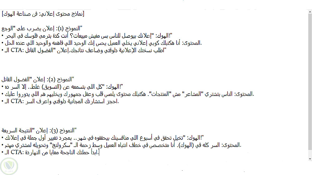 نماذج كتابة محتوى إعلاني إبداعي (Hooks & Copywriting)