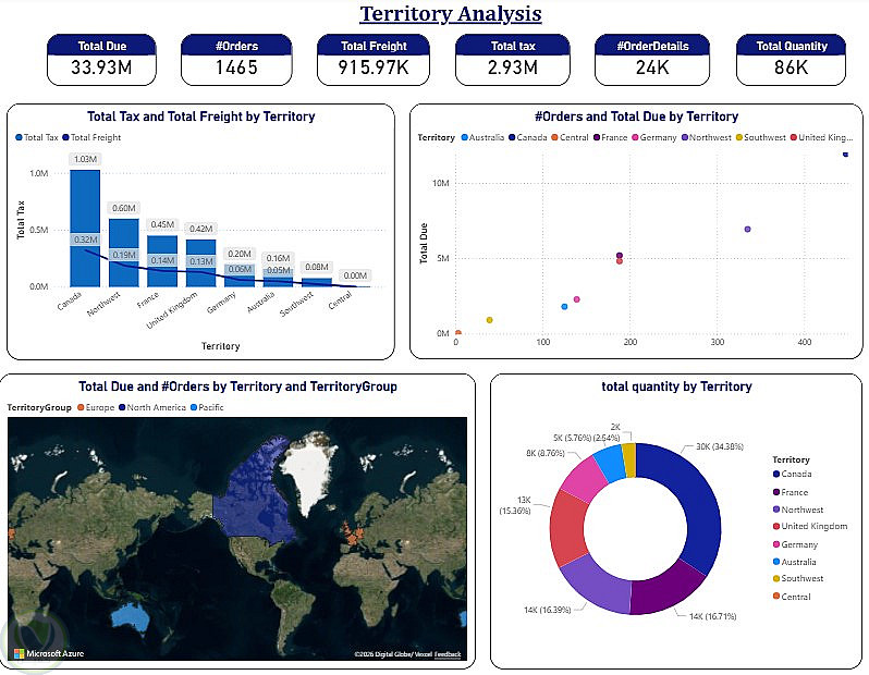 التحليل الجغرافي (Territory Analysis): استخدام خرائط تفاعلية ورسوم بيانية لتحليل المبيعات في مناطق مثل كندا وأوروبا وشمال أمريكا.