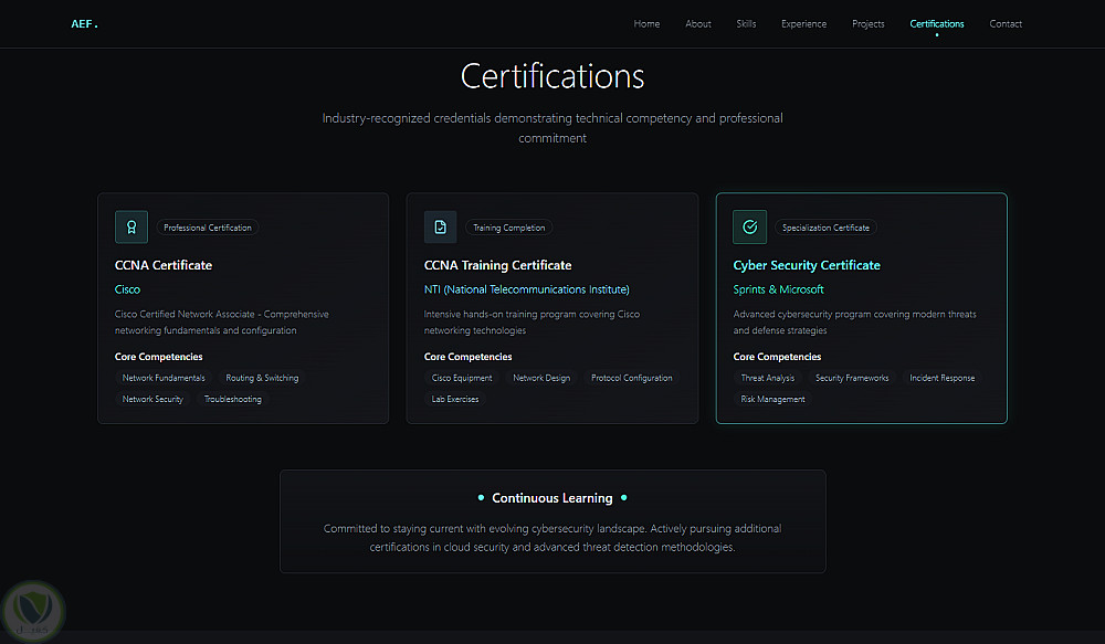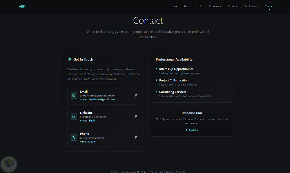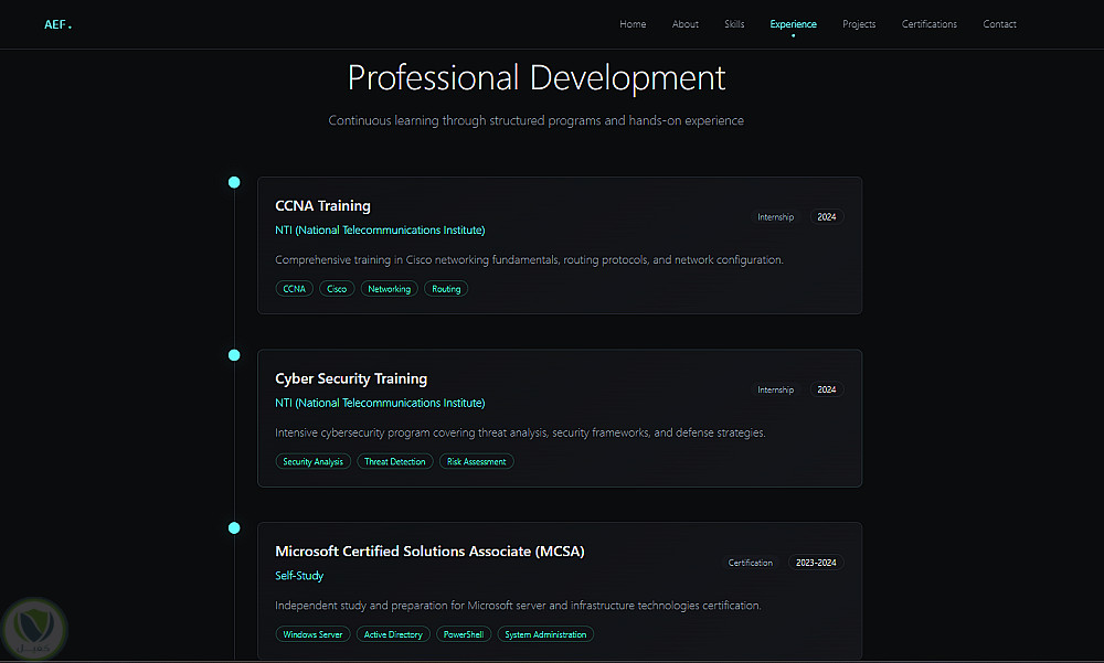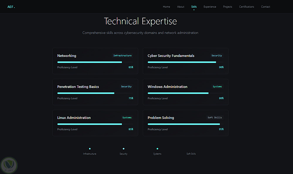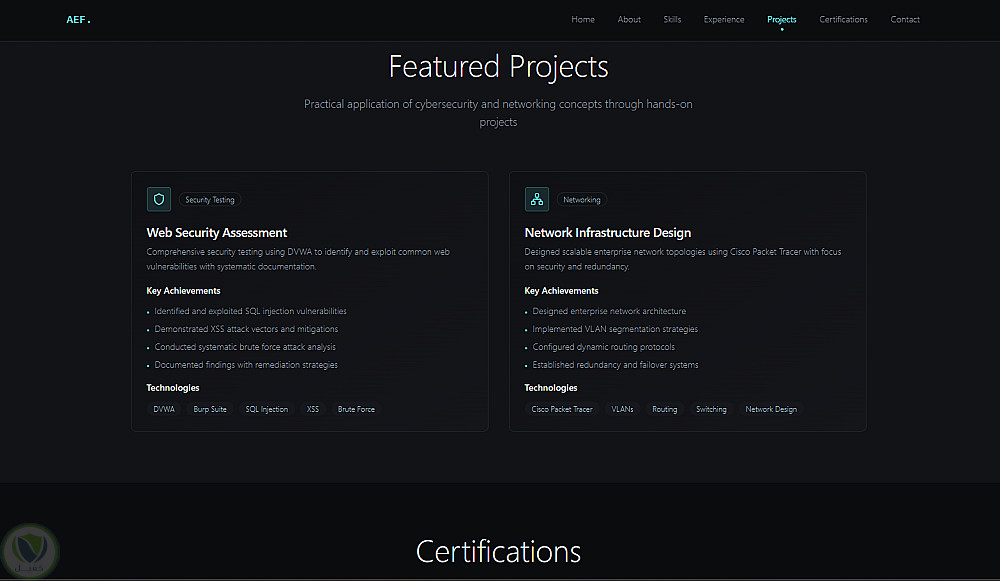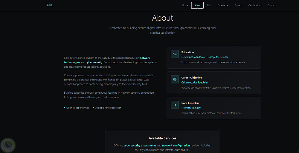 الموقع يهدف إلى إبراز المشاريع السابقة، المهارات التقنية، وطرق التواصل بشكل منظم وجذاب.
