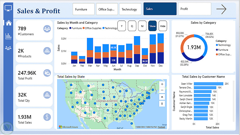 يتضمن المشروع تحليل المبيعات حسب الفئات (Furniture, Technology, Office Supplies) وعلى مدار الشهور، بالإضافة إلى توزيع المبيعات جغرافيًا على الخريطة، وأفضل العملاء من حيث حجم الشراء.