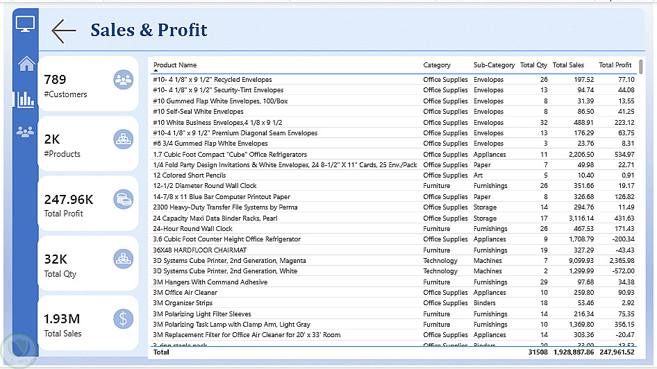 قمت بتصميم Dashboard تفاعلي باستخدام Power BI لتحليل المبيعات والأرباح بشكل شامل، حيث يعرض مؤشرات أساسية مثل عدد العملاء، عدد المنتجات، إجمالي المبيعات، والأرباح.