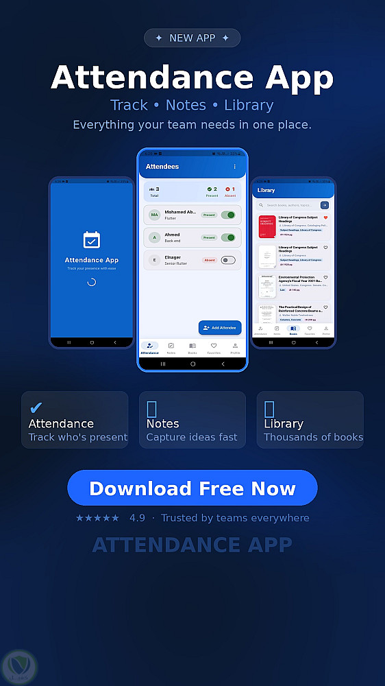 Attendance App هو تطبيق ذكي لإدارة الفرق مصمم لتتبع وإدارة حضور الموظفين أو الطلاب بكل سهولة. يتيح التطبيق للمستخدمين إضافة الحاضرين، وتحديد حالة الحضور أو الغياب في الوقت الفعلي، وأخذ الملاحظات، والتصفح في مكتبة كتب مدمجة. بواجهة بسيطة واحترافية، يوفر نظرة شاملة على إحصائيات الحضور بلمحة واحدة.