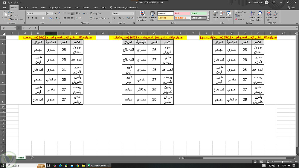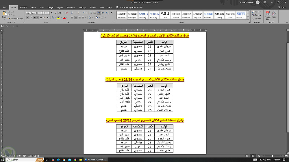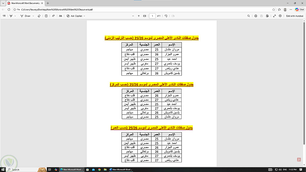تحويل ملف PDF يحتوي على جدول صفقات النادي الأهلي لموسم 2025/2026 إلى ملفي Word وExcel مع الحفاظ على ترتيب البيانات وتنسيقها بشكل منظم وواضح.