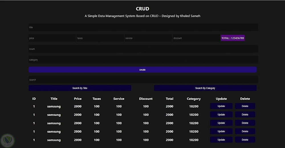 يوفر النظام واجهة إدخال لإضافة وتعديل المنتجات أو البيانات مع حقول (السعر – الضرائب – الخدمة – الخصم – الفئة) وحساب المجموع بشكل تلقائي، بالإضافة إلى نظام بحث وعرض منظم للبيانات في جدول مع إمكانية التحديث أو الحذف بضغطة زر.