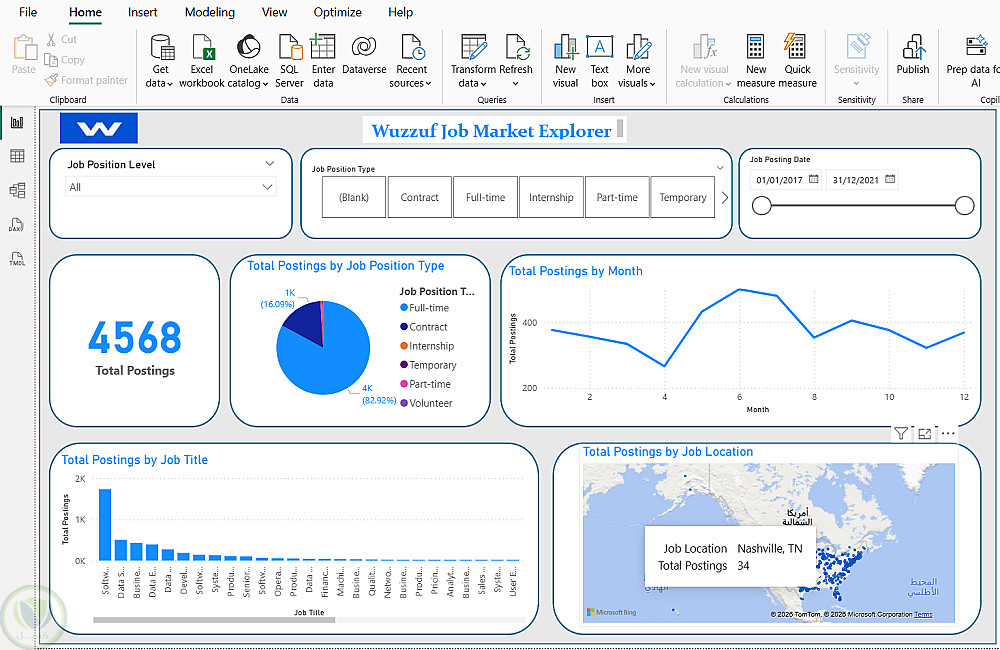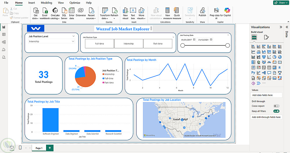 رؤية بصرية: عبر Power BI، صممت لوحة بيانات (Dashboard) تفاعلية تجيب على أهم الأسئلة: ما هي الوظائف الأكثر طلباً؟ وأين تجدها؟ وهل العمل من المكتب أم "من على الأريكة"؟