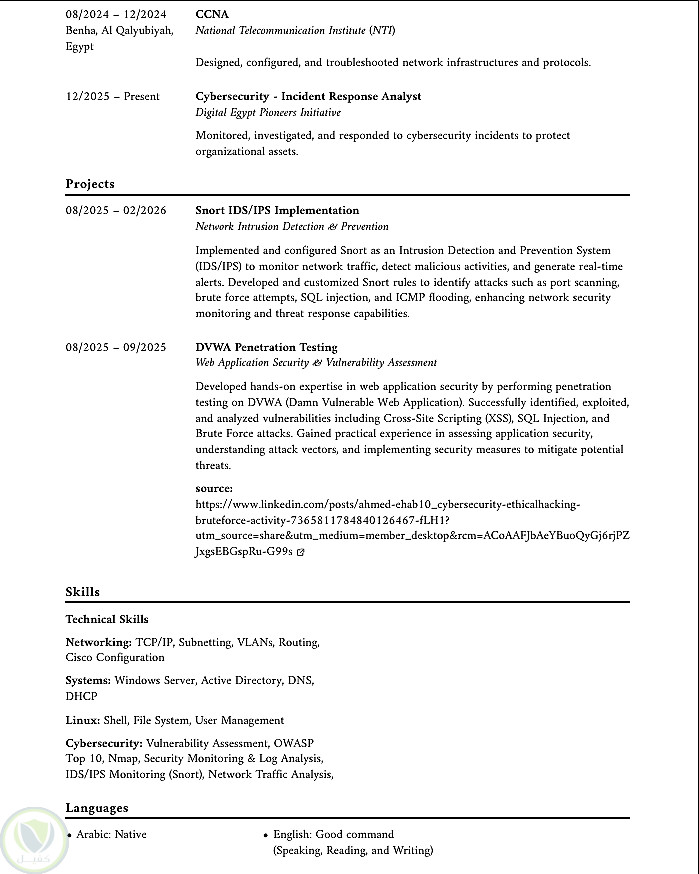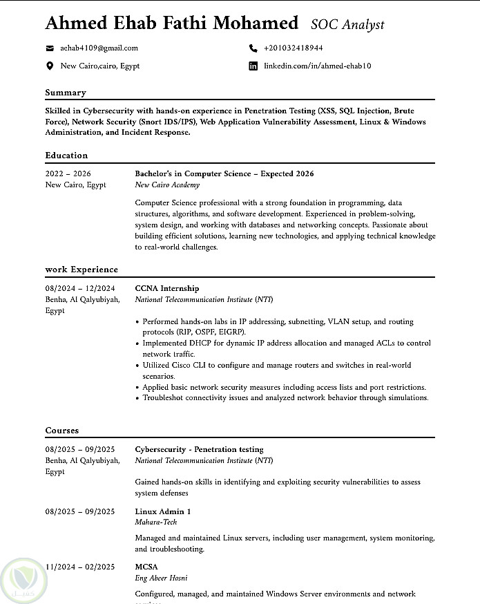 تم إعداد الـ CV وفق أفضل الممارسات الحديثة لضمان توافقه مع أنظمة التوظيف المختلفة، مع الحفاظ على شكل جذاب وواضح لأصحاب العمل.