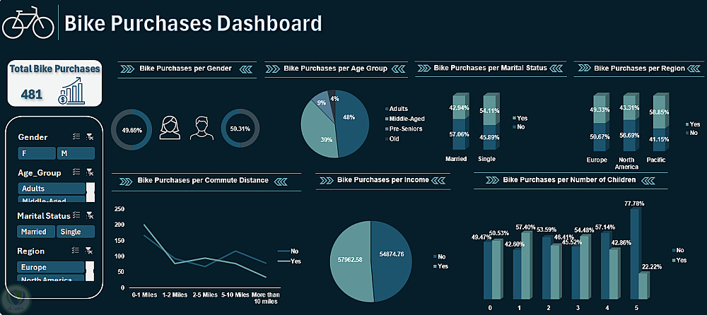تحليل بيانات 1,000 عميل لفهم سلوك الشراء وتحديد العوامل الأساسية المؤثرة على قرار شراء الدراجة، مع استخراج مؤشرات أداء واضحة تدعم القرارات التسويقية.