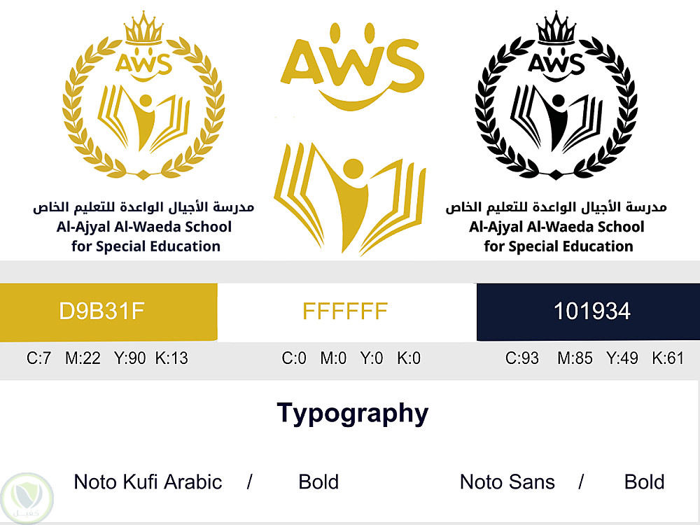 تم أعادة تصميم الشعار ليعكس رسالة تعليمية سامية بلمسة عصرية وفخمة. يتكون الشعار من رمز مركزي يدمج بين شكل الكتاب المفتوح وهيئة إنسان متطلع للمستقبل، يحيط بهما إكليل من أوراق الغار الذهبية التي ترمز للتميز والنجاح. يتوج التصميم بالتاج والحروف المختصرة "AWS" ليعطي انطباعاً بالريادة والجودة التعليمية وتصميمها بشكل كرتوني يشير لمرحلة الروضه . تم اختيار اللون الذهبي ليعبر عن القيمة العالية، مع خطوط عربية وأنجليزية واضحة تضمن سهولة القراءة والاحترافية.