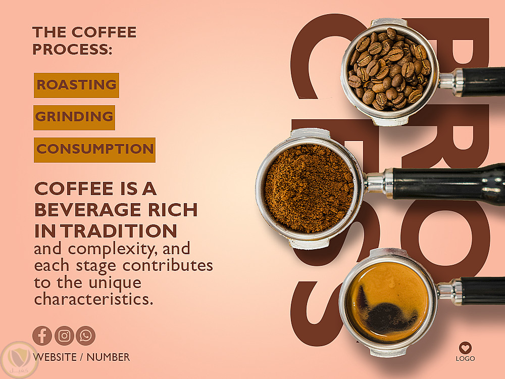 قمت بتصميم منشور سوشيال ميديا تعريفي أنيق يوضح مراحل تحضير القهوة بأسلوب بصري عصري يجمع بين البساطة والاحترافية، حيث يعرض رحلة القهوة بدءًا من التحميص مرورًا بالطحن وصولًا إلى الاستهلاك النهائي.