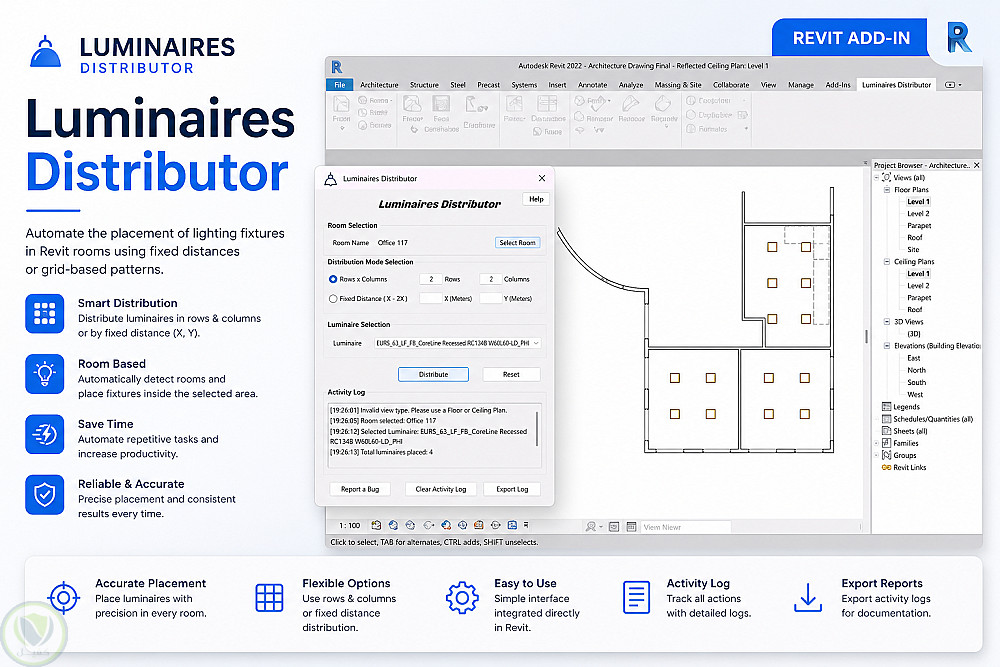 إضافة مخصصة لبرنامج Revit تهدف إلى أتمتة عملية توزيع وحدات الإضاءة (Luminaires) داخل الغرف المعمارية بشكل ذكي ودقيق، مما يقلل الوقت اليدوي ويحسن دقة التصميم في نمذجة معلومات البناء (BIM).