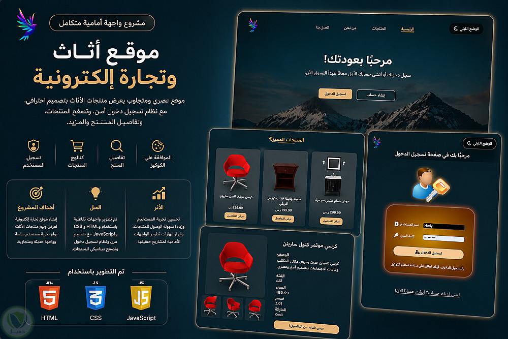 بناء موقع تجارة إلكترونية حديث ومتجاوب لبيع الأثاث، يوفر تجربة مستخدم سلسة، مع نظام تسجيل دخول، وتصفح ديناميكي للمنتجات باستخدام HTML وCSS وJavaScript.