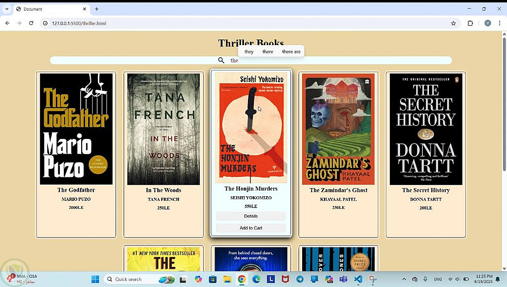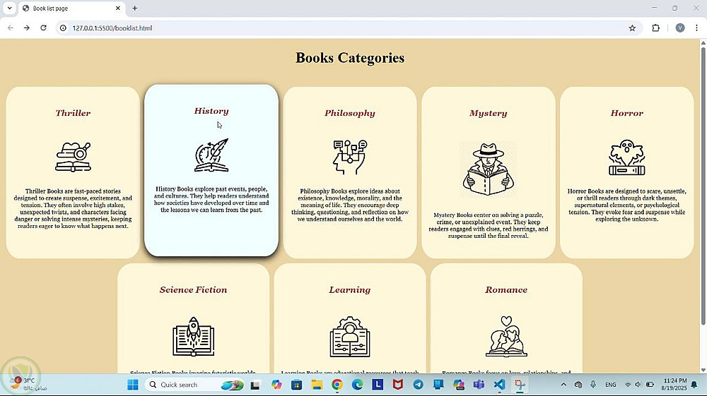 • تصميم 8 أقسام (Thriller, History, Philosophy, إلخ) بأسلوب نظيف وحديث.