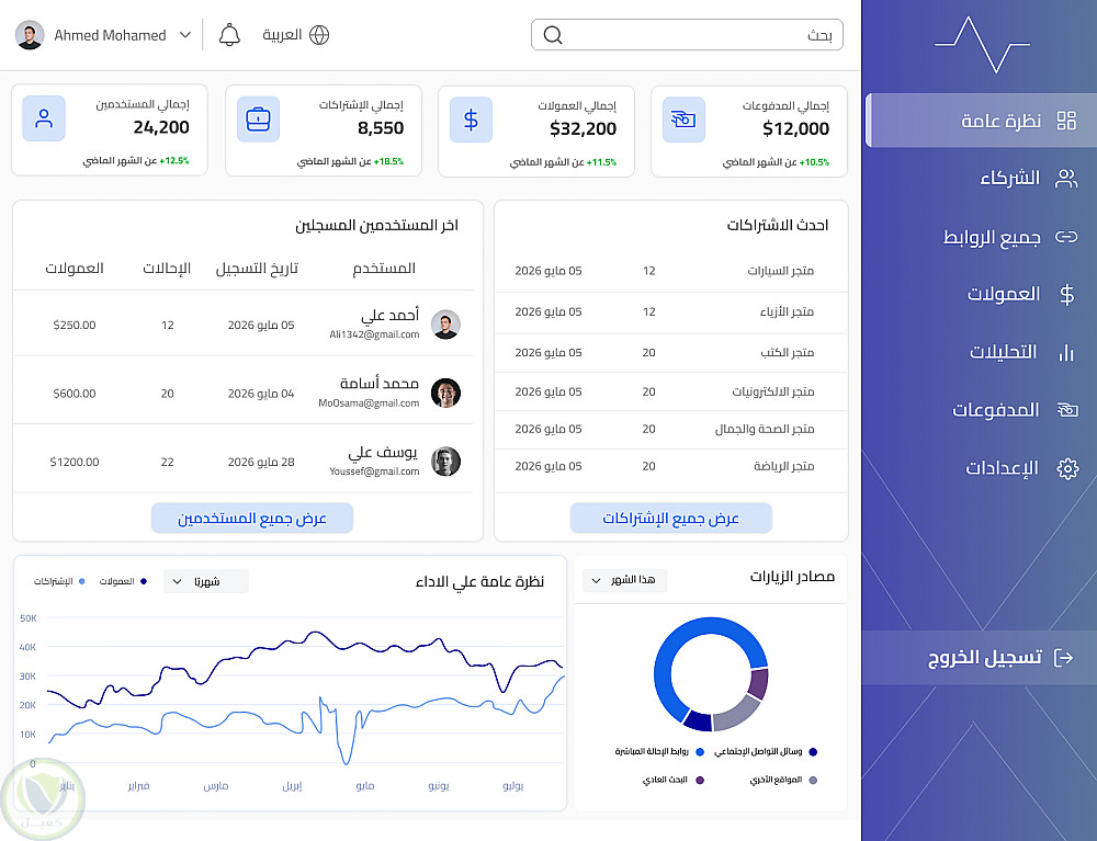 يعتمد التصميم على تنظيم بصري دقيق يبرز المؤشرات الرئيسية (KPIs) في أعلى الصفحة، مثل عدد المستخدمين، الاشتراكات، العمولات، والمدفوعات، مع عرض نسب التغيير بشكل واضح لدعم اتخاذ القرار.