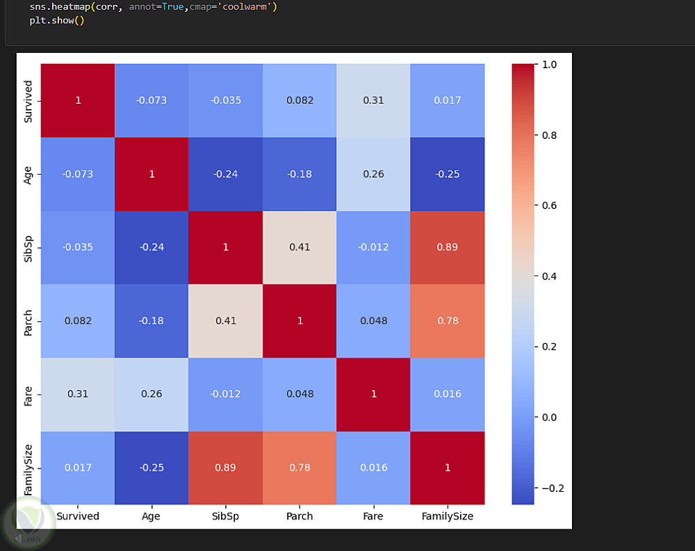 عرض خريطة حرارية لإظهار قوة العلاقة بين الميزات واستهداف "النجاة"، حيث أظهرت الأجرة أعلى ارتباط بالهدف.