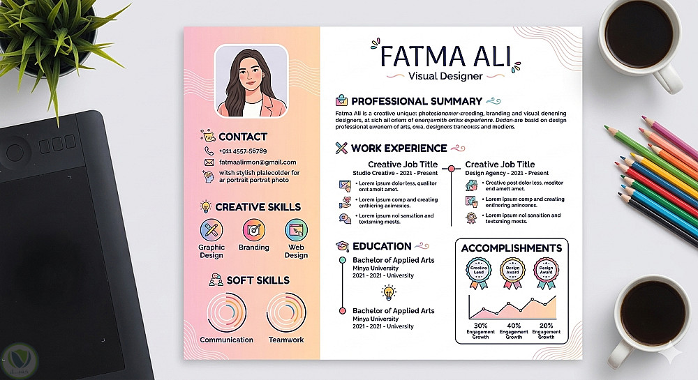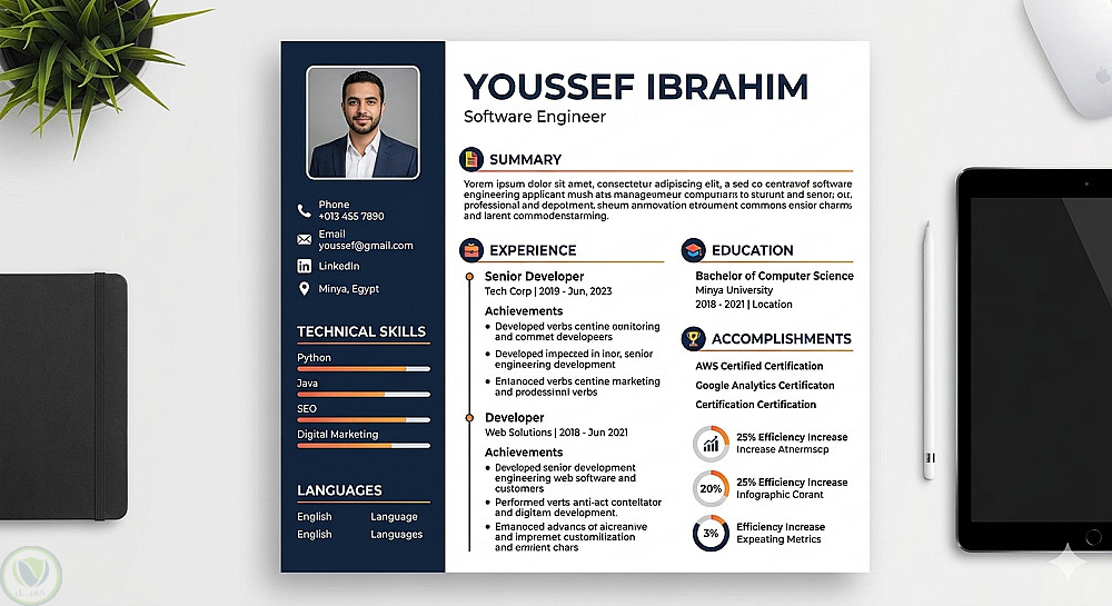 عناصر داعمة: دمج أيقونات بصرية بسيطة لتمثيل المهارات والبيانات الشخصية، مما يضفي لمسة عصرية دون الإخلال بالرسمية.