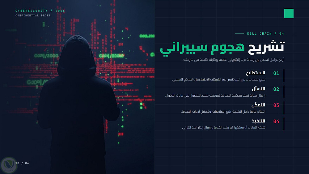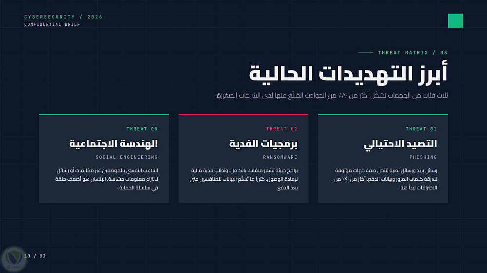 استعراض لأبرز التهديدات الرقمية التي تستهدف الشركات، مع تقديم استراتيجيات دفاعية عملية وفعالة لحماية البيانات وبناء "جدار حماية بشري" لضمان استمرارية الأعمال في عالم محفوف بالمخاطر