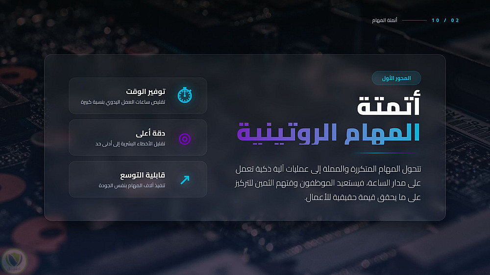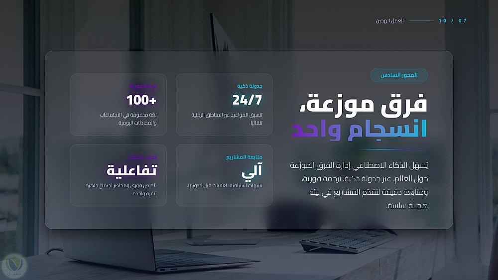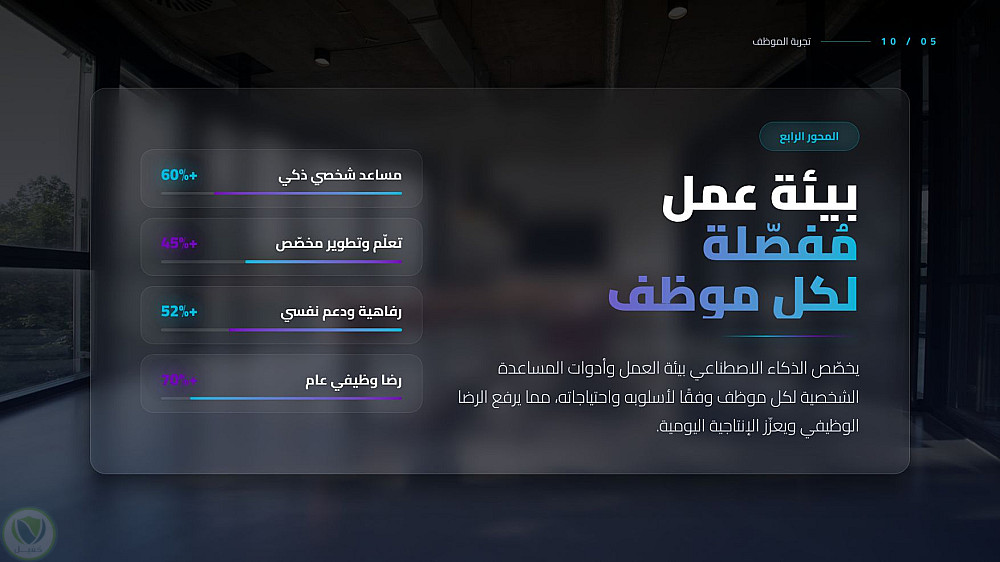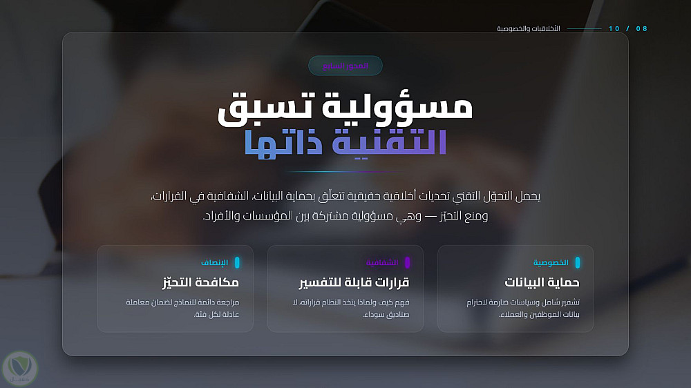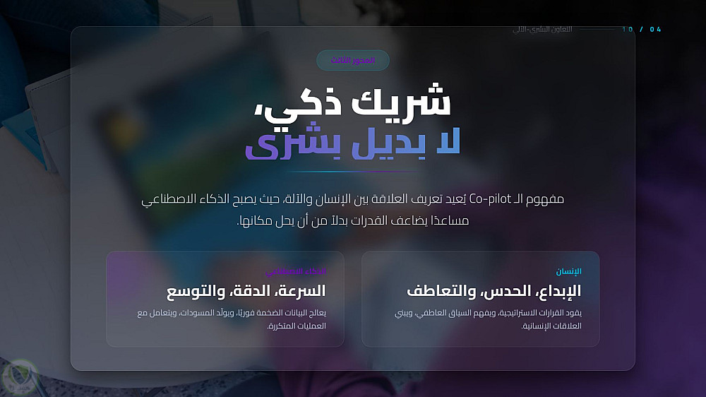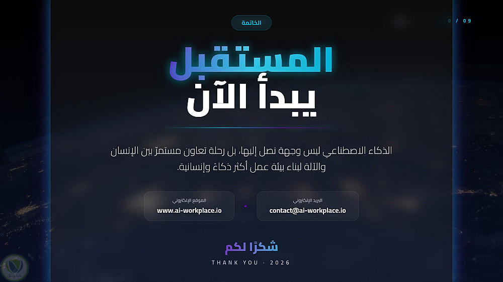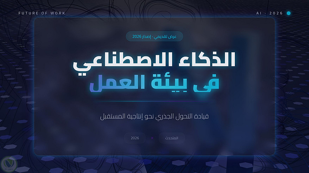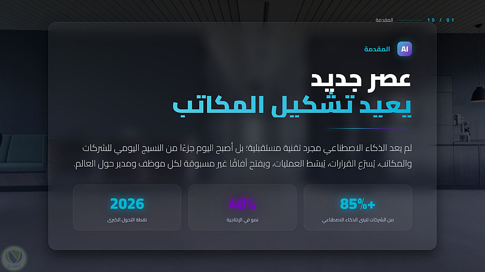 عرض تقديمي احترافي يستعرض التحول الجذري الذي يقوده الذكاء الاصطناعي في المكاتب الحديثة، من تحسين كفاءة المهام إلى تعزيز الابتكار البشري، مع التركيز على الجوانب الأخلاقية والمستقبلية للعمل المشترك بين الإنسان والآلة