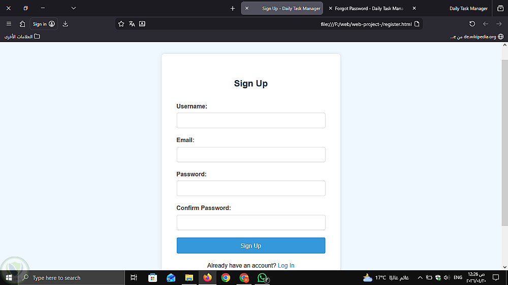 إدارة المهام (CRUD Operations): نظام مرن يتيح للمستخدم إضافة، تعديل، حذف، وعرض المهام اليومية بكل سهولة.