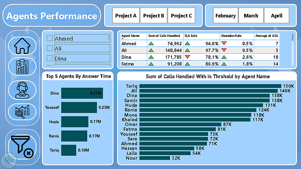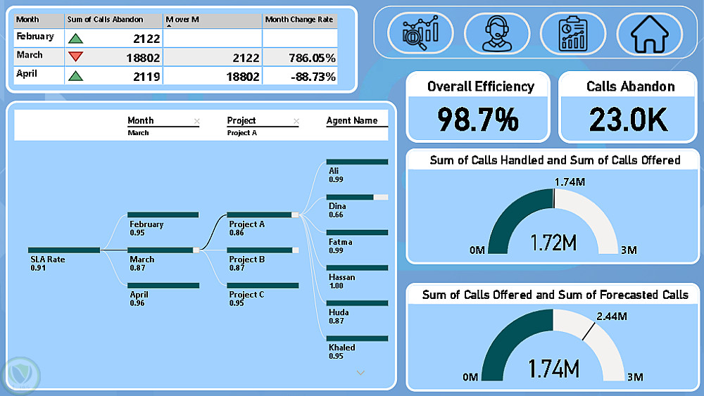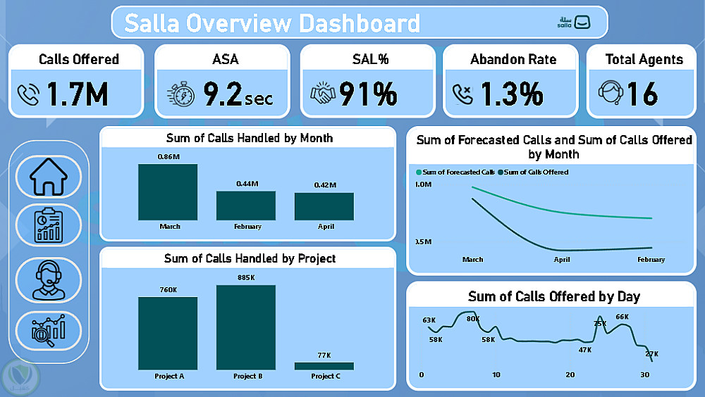 يتضمن المشروع جمع وتنظيم البيانات، بناء نموذج بيانات قوي، واستخدام DAX لحساب مؤشرات مهمة مثل عدد المكالمات، نسبة المكالمات المفقودة، مستوى الخدمة SLA، ومتوسط سرعة الرد ASA.