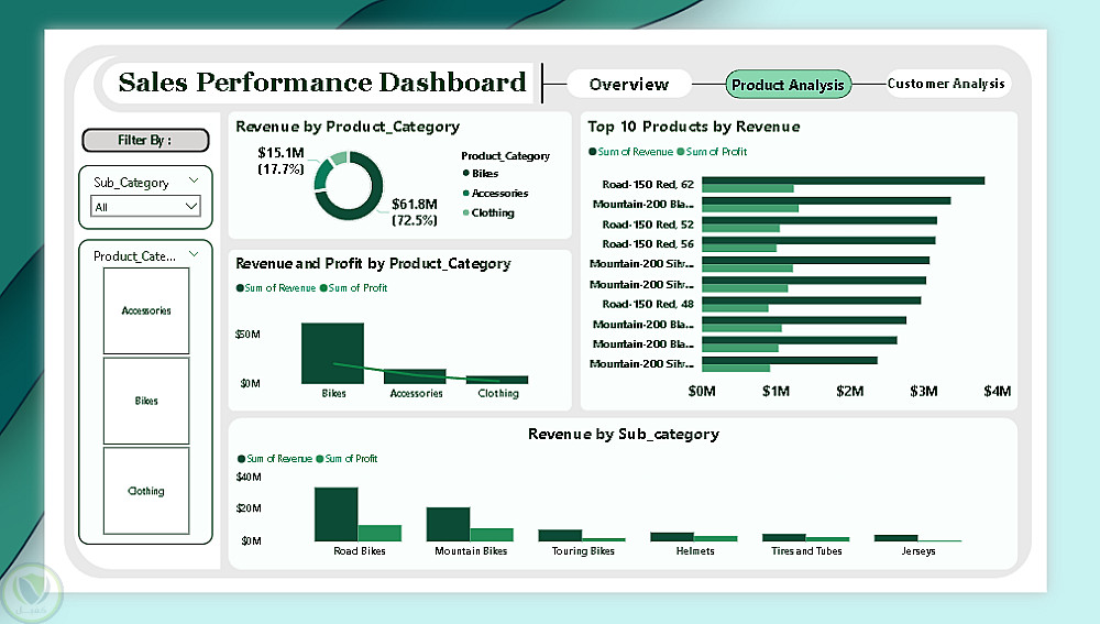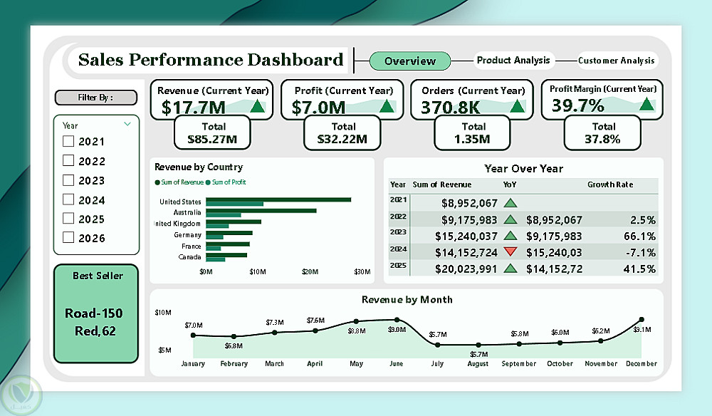 يتضمن المشروع تحليل مؤشرات رئيسية مثل الإيرادات، الأرباح، وعدد الطلبات، مع مقارنة الأداء السنوي وتحليل النمو، بالإضافة إلى تحديد أفضل المنتجات والفئات مبيعًا.