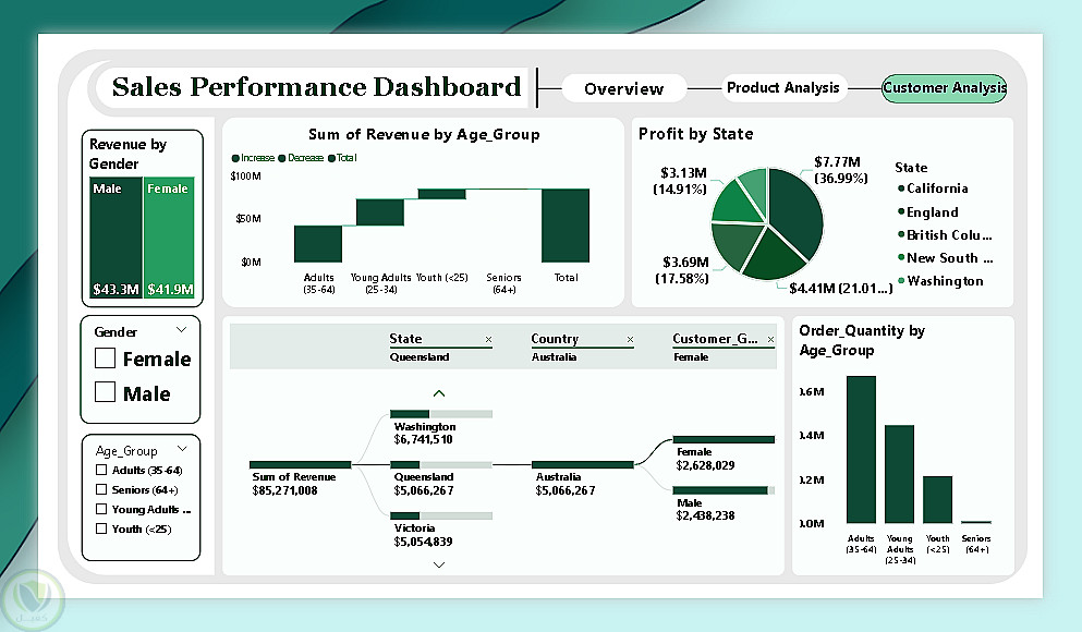 كما يشمل تقسيم العملاء حسب الجنس والفئة العمرية، وتحليل الأداء الجغرافي على مستوى الدول والمناطق، مع عرض النتائج من خلال Dashboard تفاعلي بتصميم عصري وسهل الاستخدام.