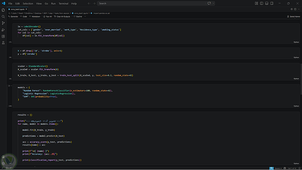 المشروع ده مش مجرد كود بايثون، ده رحلة بدأت بتنقية بيانات معقدة (Noise reduction)، وتحديد العوامل اللي فعلاً بتغير النتيجة (Feature Engineering) زي اكتشاف علاقة الأمطار التراكمية بالفيضانات أو ربط المؤشرات الحيوية بمخاطر السكتات. استخدمت أقوى نماذج تعلم الآلة (Random Forest, SVM, XGBoost) مش بس عشان أحقق دقة عالية (Accuracy)، لكن عشان أوصل لنتائج منطقية وقابلة للتطبيق على أرض الواقع.