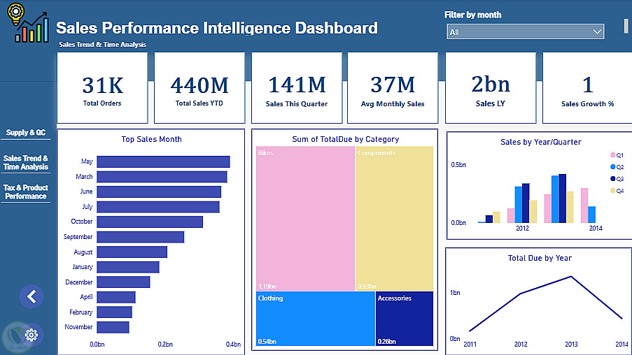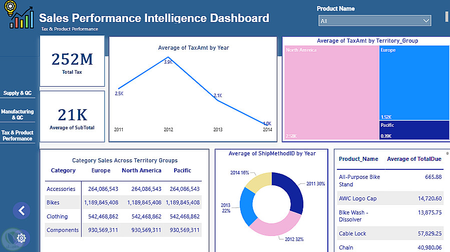 يقدم هذا المشروع لوحة معلومات تفاعلية باستخدام Power BI لتحليل أداء المبيعات بالاعتماد على بيانات AdventureWorks 2019، بهدف متابعة اتجاهات المبيعات، أداء المنتجات، وتحليل الضرائب لدعم القرارات المبنية على البيانات.
