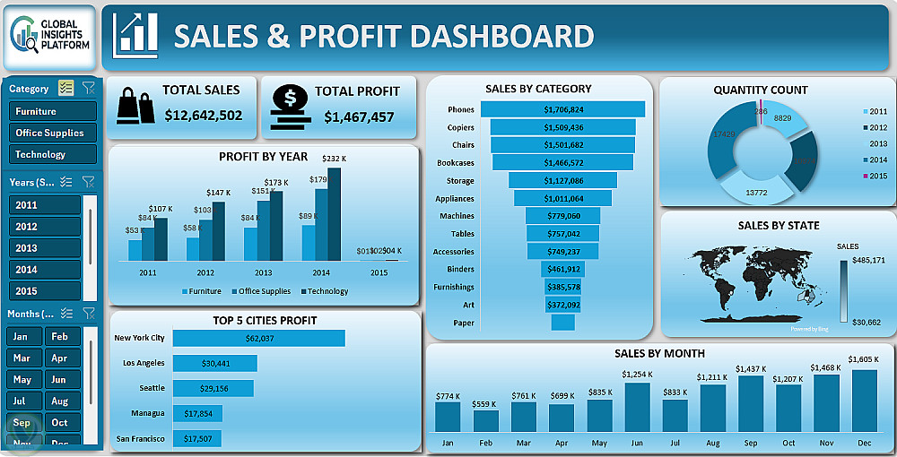 لوحة تنفيذية لقياس المبيعات والأرباح حسب الفئات والزمن والمناطق، تساعد الإدارة على رؤية الأداء العام، تحديد الأعلى ربحية، وتحليل الاتجاهات لاتخاذ قرارات سريعة مبنية على البيانات.