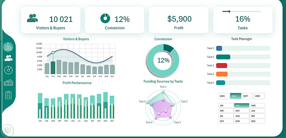 Visitors & Buyers: 10,021 — Conversion: 12% — Profit: $5,900 — Tasks: 16%.