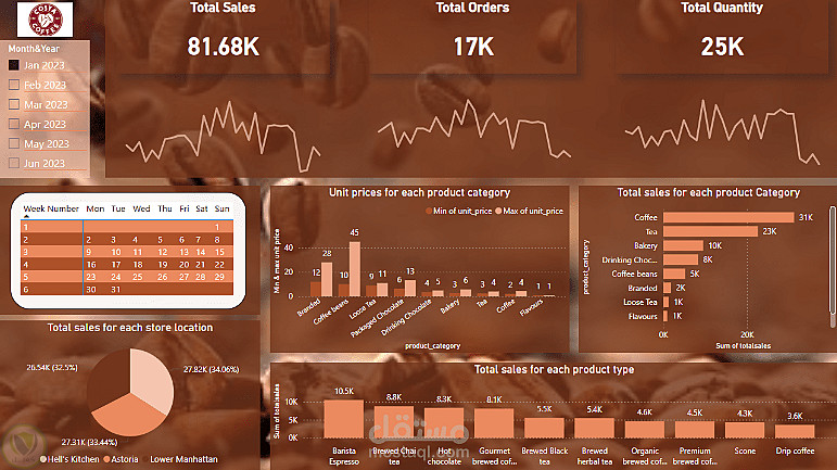 تم تصميم لوحة تفاعلية لعرض وتحليل مبيعات كوستا كوفي باستخدام Power BI، تشمل إجمالي المبيعات والطلبات والكميات، مع تحليل حسب الفروع والفئات والمنتجات. تم تنظيف وتجهيز البيانات باستخدام SQL لضمان دقة النتائج ووضوحها.