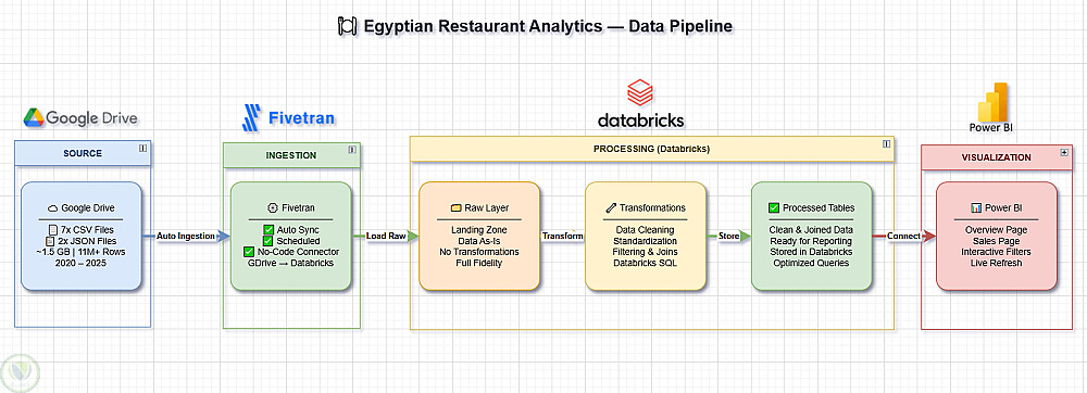 بدأت بسحب البيانات من Google Drive إلى Databricks باستخدام Fivetran، وده وفر طريقة احترافية وAutomated لعملية الـ Data Ingestion بدل التعامل اليدوي مع الملفات.