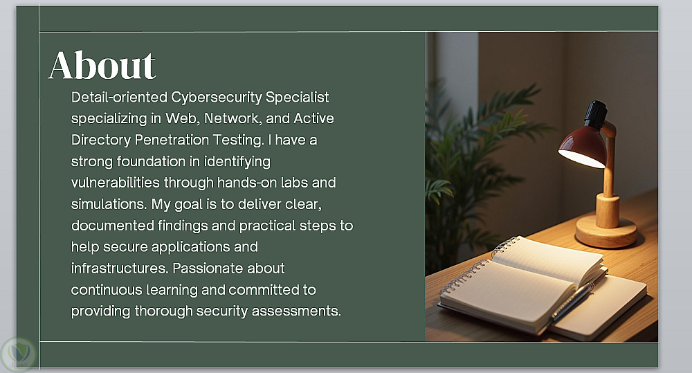 يهدف هذا العرض إلى تقديم صورة شاملة عن صاحب الـ Portfolio من خلال عرض معلوماته بطريقة بصرية واضحة وجذابة، تشمل المهارات الأساسية، والخبرات، وأبرز الأعمال أو الإنجازات.