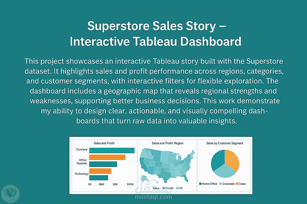 أنشأت قصة تفاعلية باستخدام بيانات مجموعة Superstore على Tableau Public، بهدف تسليط الضوء على أهم الرؤى المرتبطة بالمبيعات، الأرباح، فئات المنتجات، والمناطق الجغرافية.